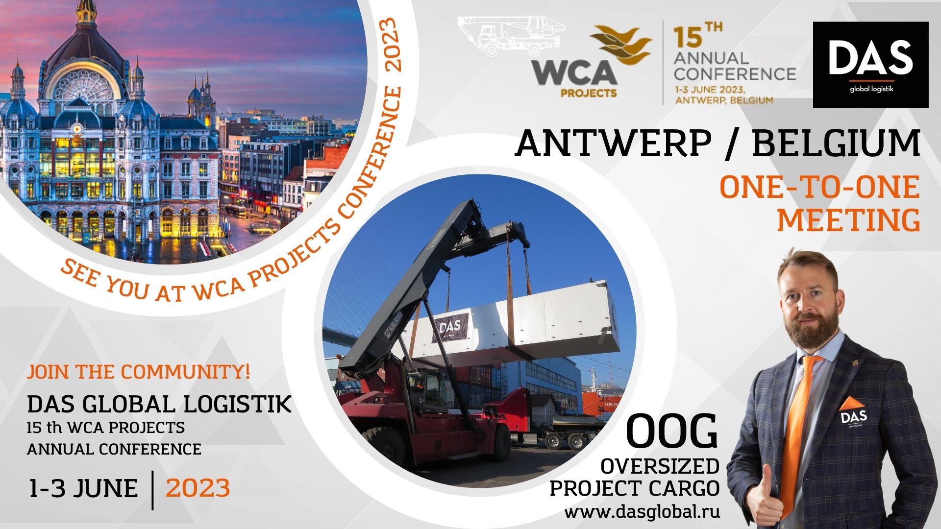 Почерпнуть для себя новые знания и идеи развития логистического бизнеса можно будет на международной 15-й конференции WCA PROJECTS 2023, которая проходит в Антверпене, Бельгия, с 1 по 3 июня 2023 года в отеле Radisson Blu Astrid, где компания ДАС ГЛОБАЛ ЛОДЖИСТИК выступит в качестве эксперта по организации проектных перевозок крупногабаритных, тяжеловесных и негабаритных грузов, а также представит свой профессиональный опыт заинтересованным специалистам крупных международных компаний со всего мира.
